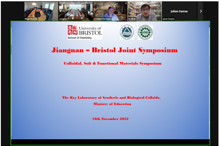 11月10日,我院举办首届江南大学-布里斯托大学“胶体、软物质与功能材料”联合研讨会(Jiangnan – Bristol Joint Symposium on Colloidal, Soft & Functional Materials )。参加本次研讨会的双方师生共计约200人。beat365官方网站副院长马丕明教授,崔正刚教授,刘雪锋教授,蒋建中教授以及合成与生物胶体重点实验室的部分骨干教师线下参加了本次研讨会。布里斯托大学化学学院院长Emma Raven教授、科学学部国际交流主任Charl F. J. Faul教授、化学学院国际交流主任Wuge H Briscoe 教授等专家学者在英国集体线下参会。