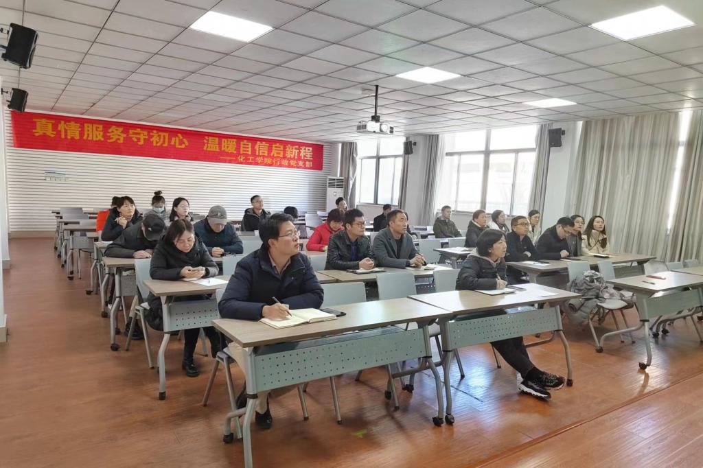 12月2日上午,我院教工行政党支部邀请学院党委副书记兼副院长田卫平同志作主题为“学习党的二十大踔厉奋进新征程”的党的二十大精神专题学习报告会,学院全体行政工作人员、学生辅导员,以及教工应化系党支部部分党员共计30余人聆听了报告,报告会由教工应化系党支部书记李云兴、教工行政党支部书记阮小云分别主持。